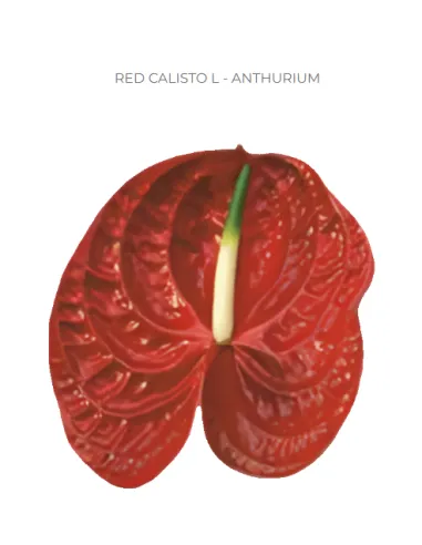 The large Calisto red anthurium is a showstopping tropical bloom known for its deep, velvety red spathe and high-gloss finish. Its heart-shaped form and bold coloration give it a sculptural, almost lacquered appearance, making it a dramatic focal point in modern and exotic floral designs.