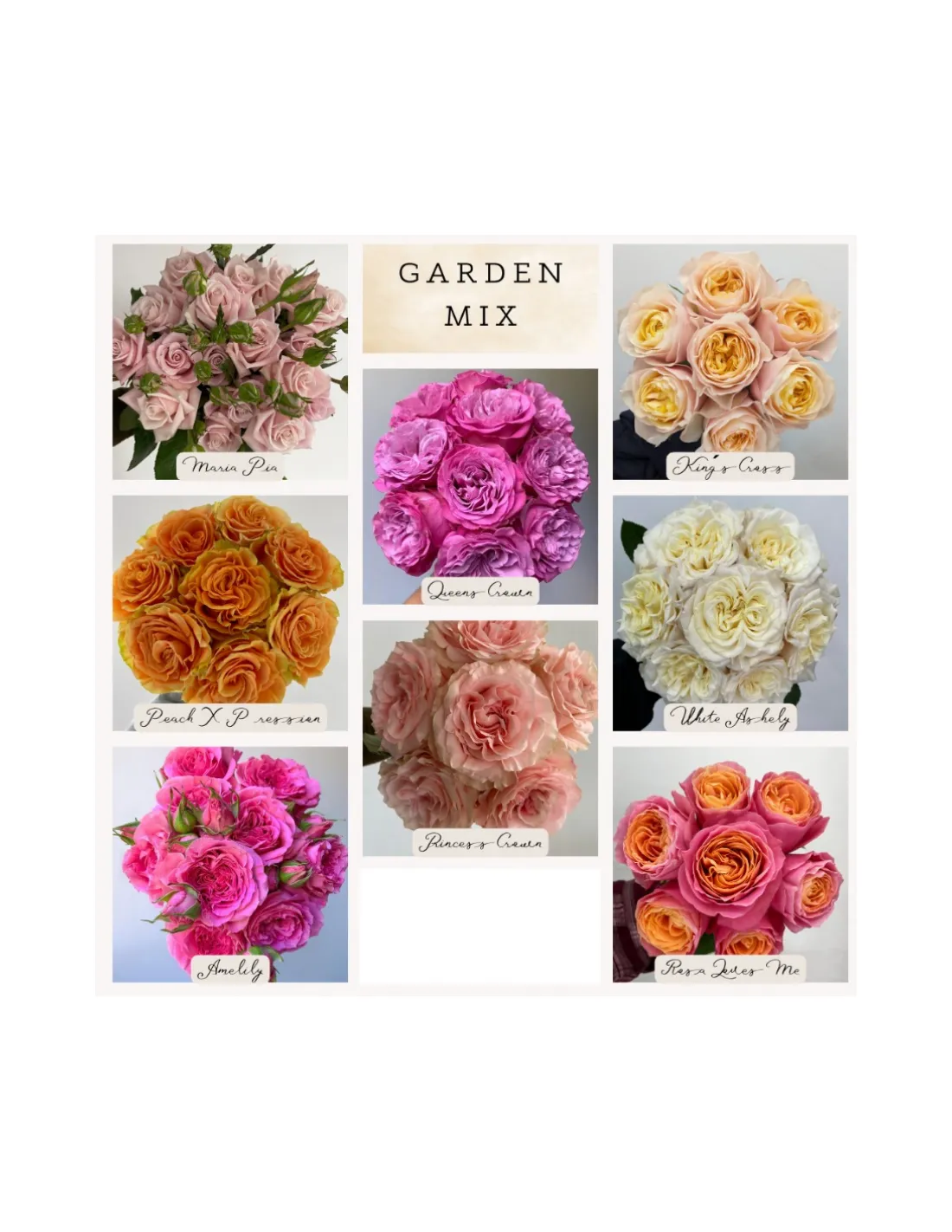 Includes Maria Pia, Queen's Crown, King's Cross, White Ashley, Peach Expression, Princess Crown, Resa Loves Me, and Amelily