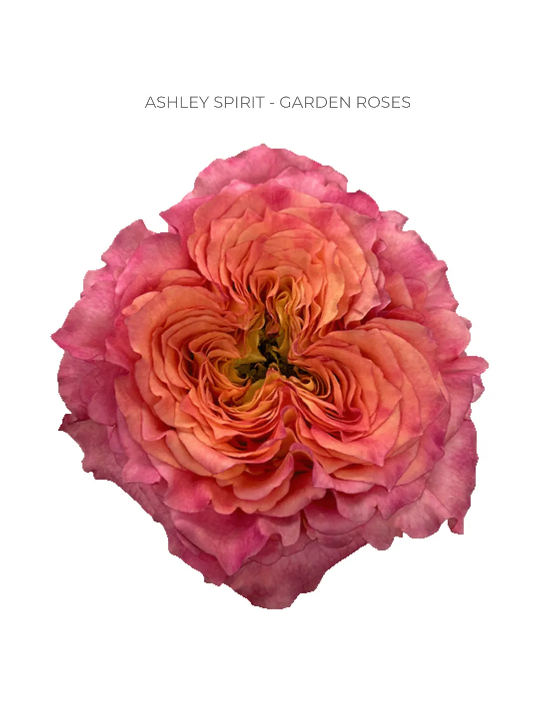 Ashley Spirit is a captivating garden rose with a warm, bicolor palette that blends soft orange and pink tones. Its blooms are full and rounded, with a generous petal count that gives it a plush, romantic appearance. The petals often display a gentle gradient, making each flower feel like a miniature sunset—ideal for autumnal arrangements or any design that calls for warmth and elegance.