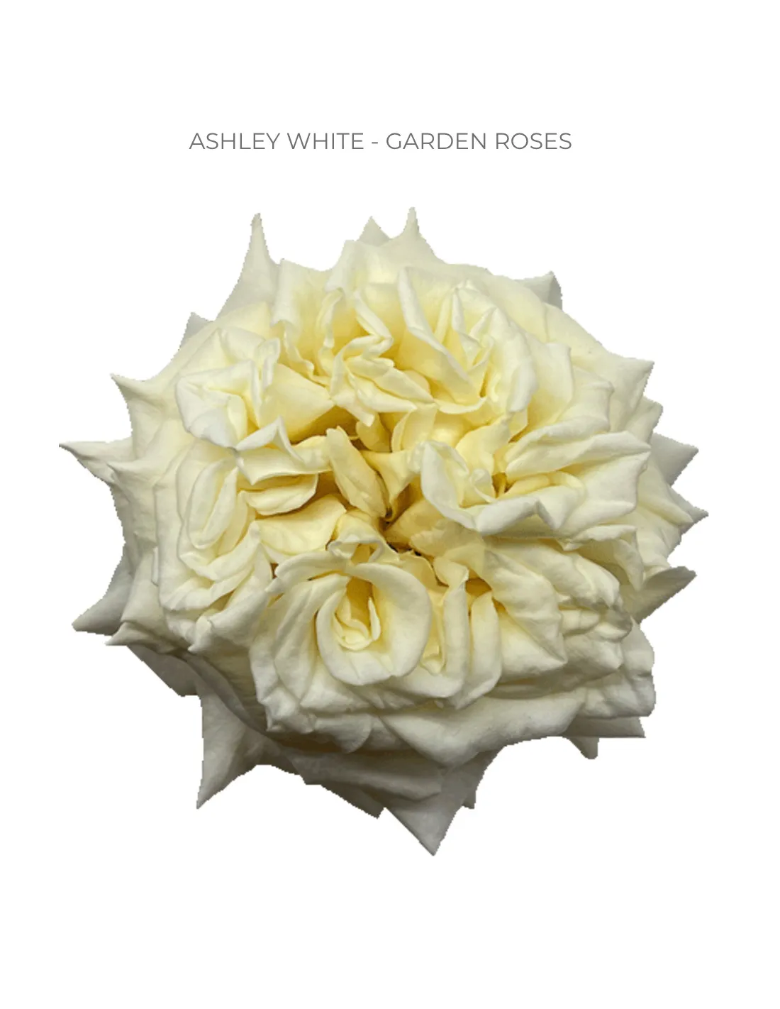 Ashley White Garden Rose features crisp white petals, a full ruffled bloom, and a clean, elegant garden‑rose silhouette. A premium designer variety ideal for weddings, bouquets, and luxury event design.