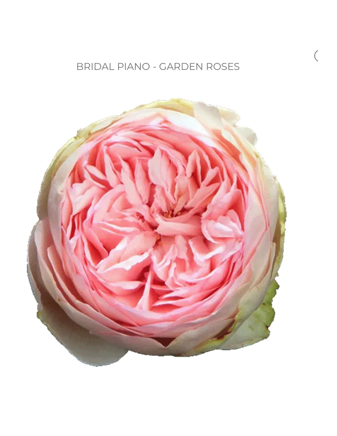 Bridal Piano Garden Rose features soft blush‑pink petals, a lush ruffled bloom, and a romantic, cupped garden‑rose form. A premium wedding rose beloved for its elegance, fullness, and consistently beautiful opening.