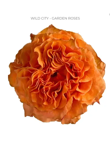 Wild City garden roses offered wholesale for florists are described as a variety known for their striking dark orange color and resemblance to garden-style roses.