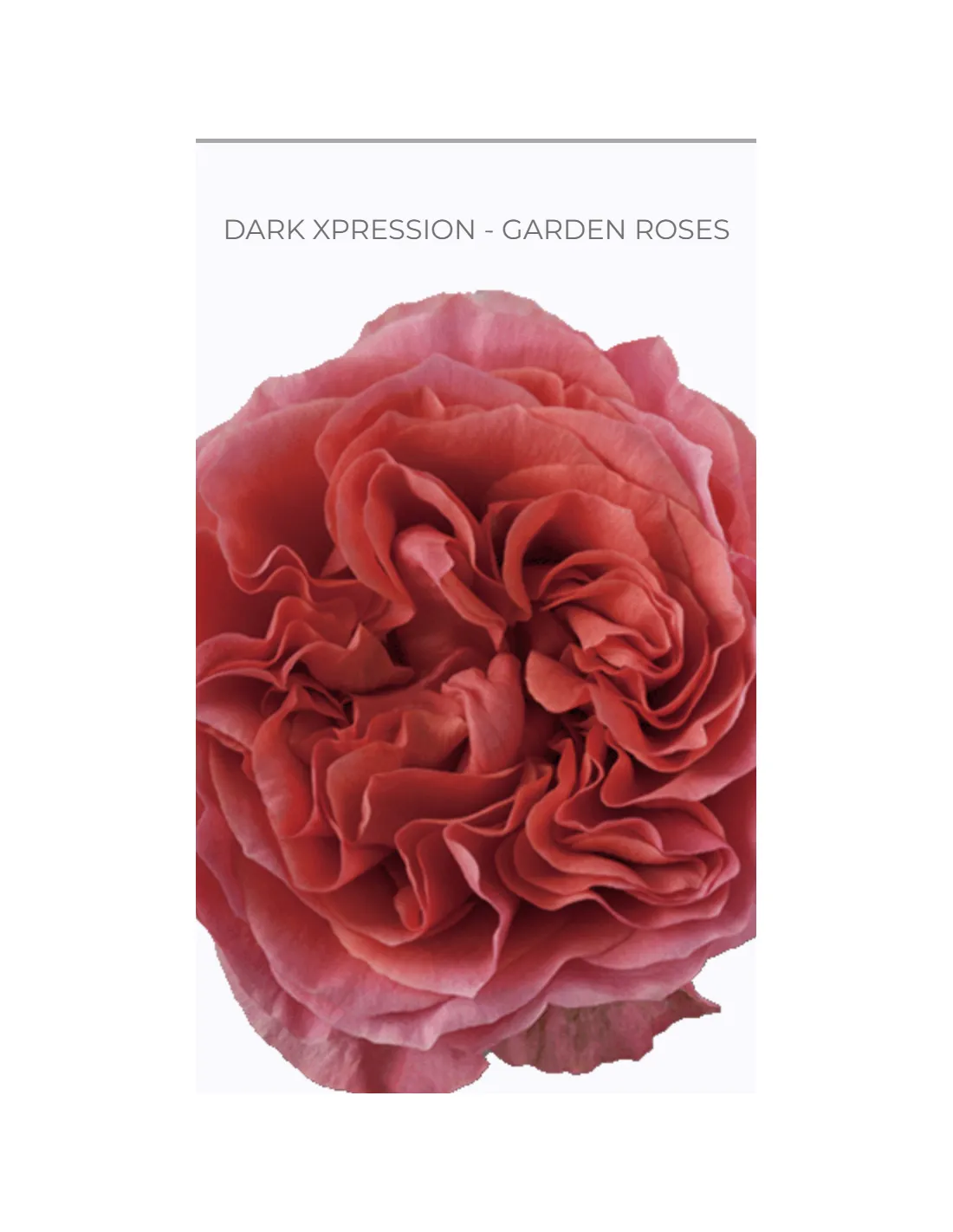 The Dark Xpression Garden Rose is a bold, luxurious variety with a fiery coral center and darker outer petals, offering dramatic elegance for weddings, luxury events, and professional floral design.