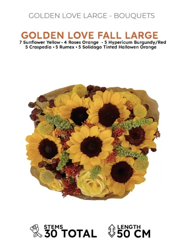 Introducing a vibrant and striking pre-made bouquet that combines the warmth and charm of sunflowers with the elegance of roses and the unique textures of hypericum, craspedia, rumex, and solidago.