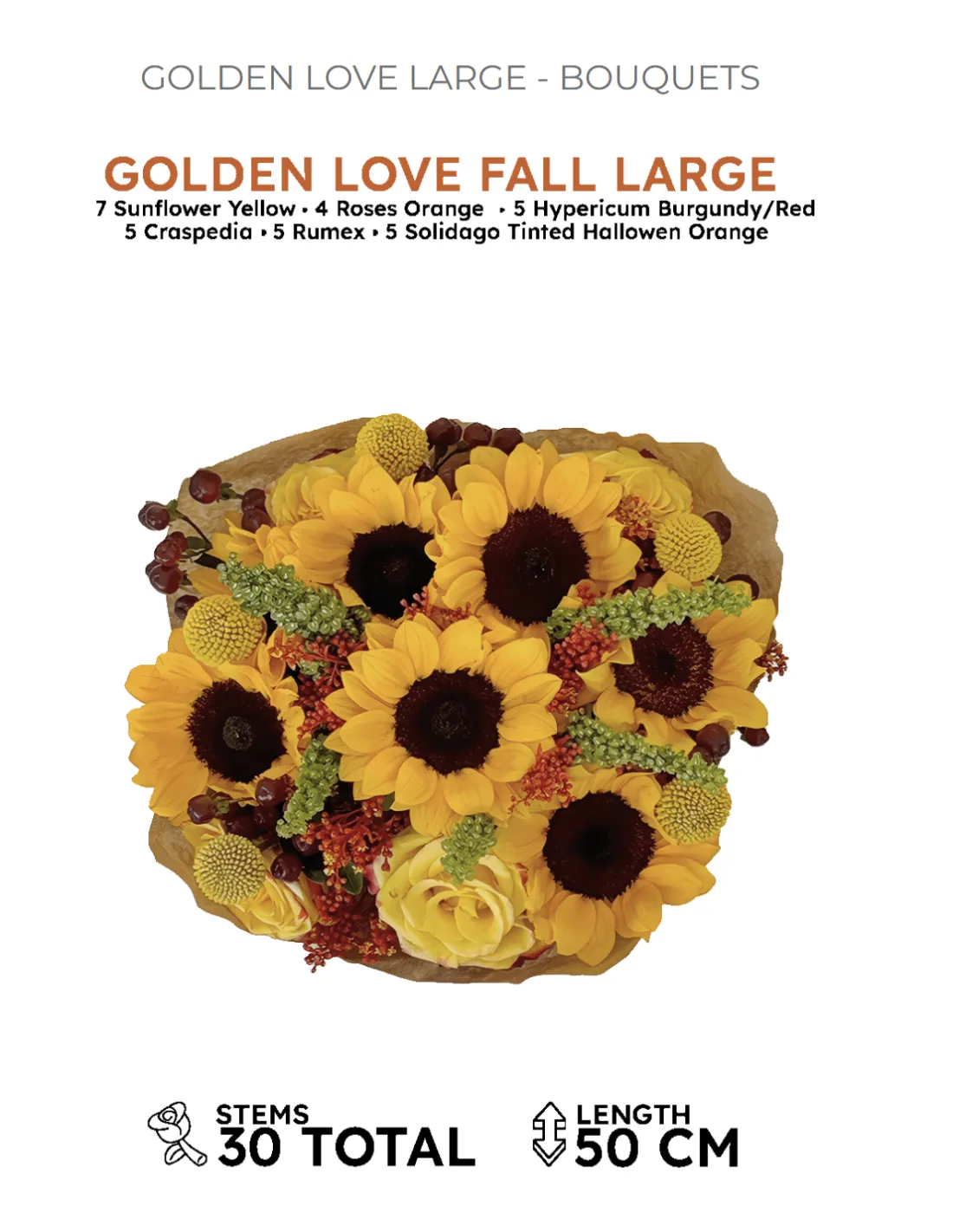 Each bouquet features 7 radiant sunflowers, 4 stunning orange roses, and an assortment of 5 hypericum burgundy, 5 craspedia, 5 rumex, and 5 solidago tinted orange, making up a total of 30 stems.