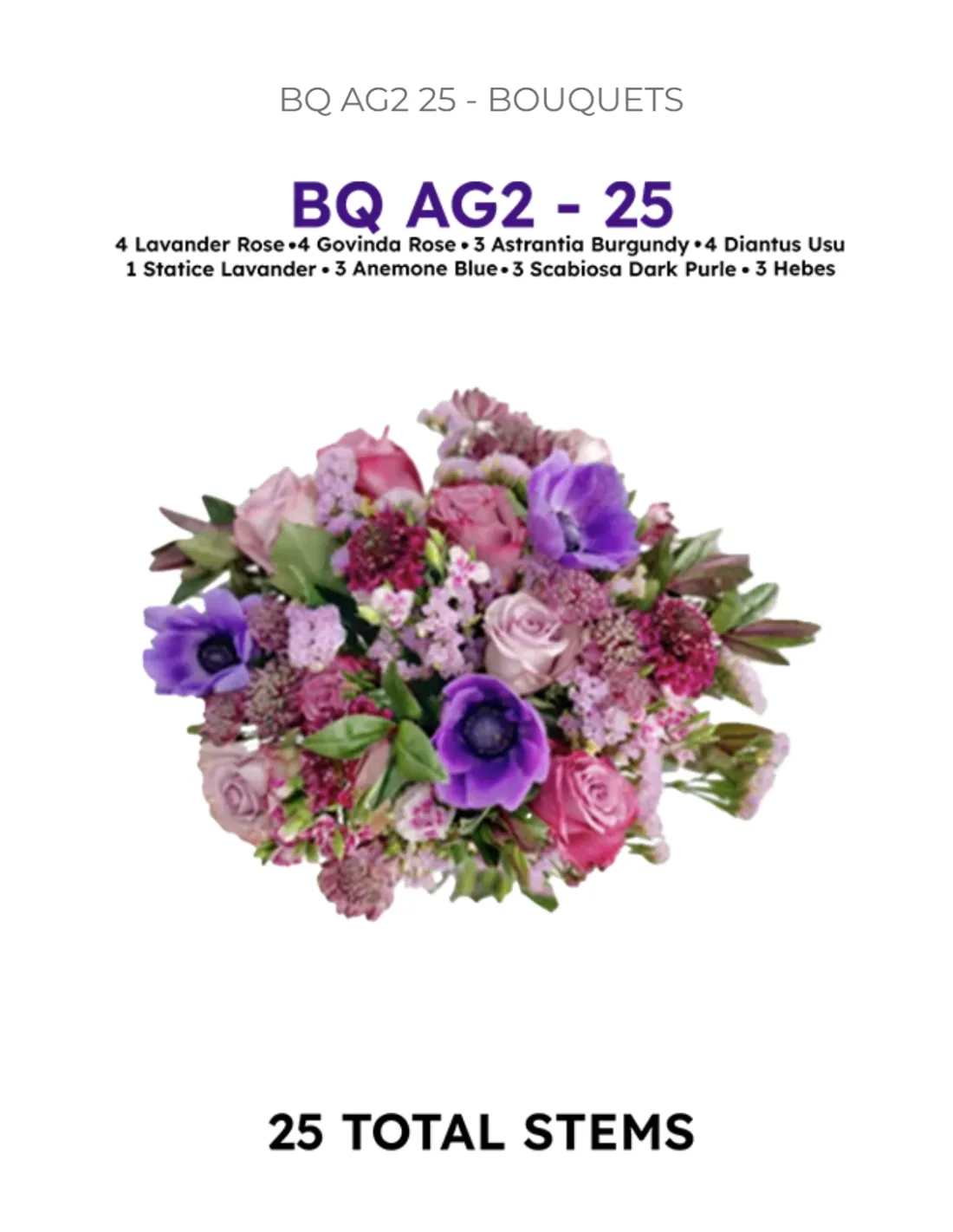 Accented with 1 statice lavender, 3 anemone blue, and 3 scabiosa dark purple