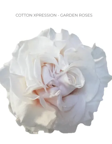 Creamy white with a whisper of blush at the petal base, Cotton Xpression Roses are a luxurious garden-style variety prized for their voluminous ruffles, romantic texture, and soft luminosity. Their layered petals unfold into a full, cupped bloom that evokes vintage charm with modern refinement.